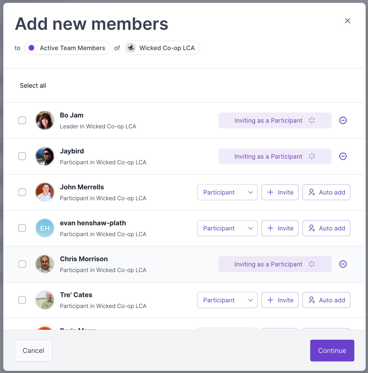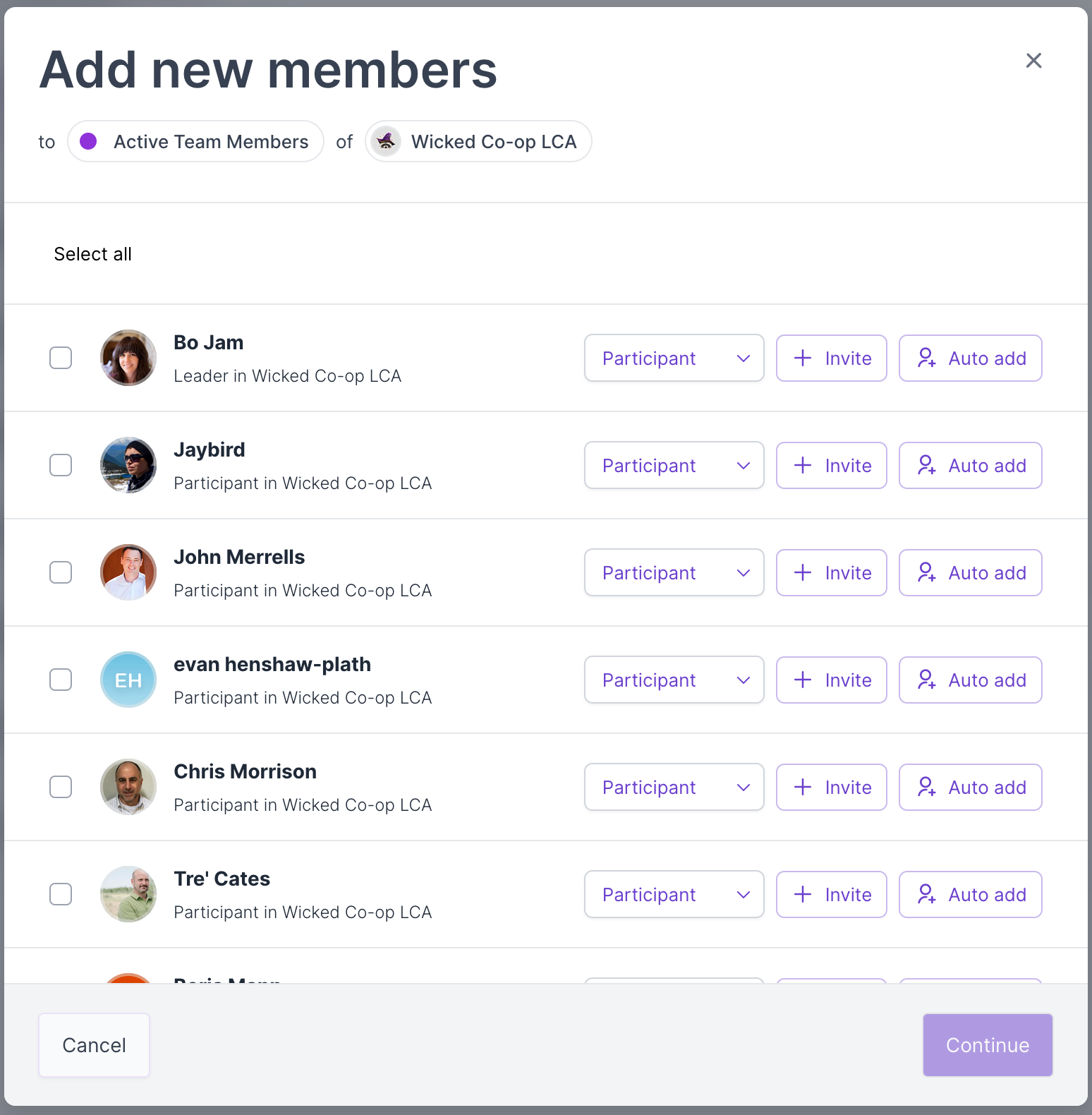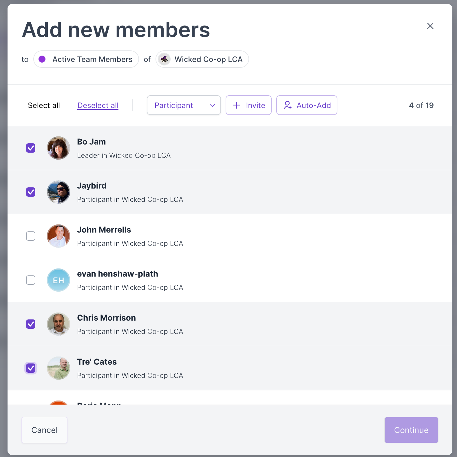 The Add Members button will open a list of the group members not in the subgroup. Leaders in the main group will be able to "auto-add" people, pulling them into the subgroups relevant to them. Other participants will need to invite new members, who will get an email alerting them and a link to accept.