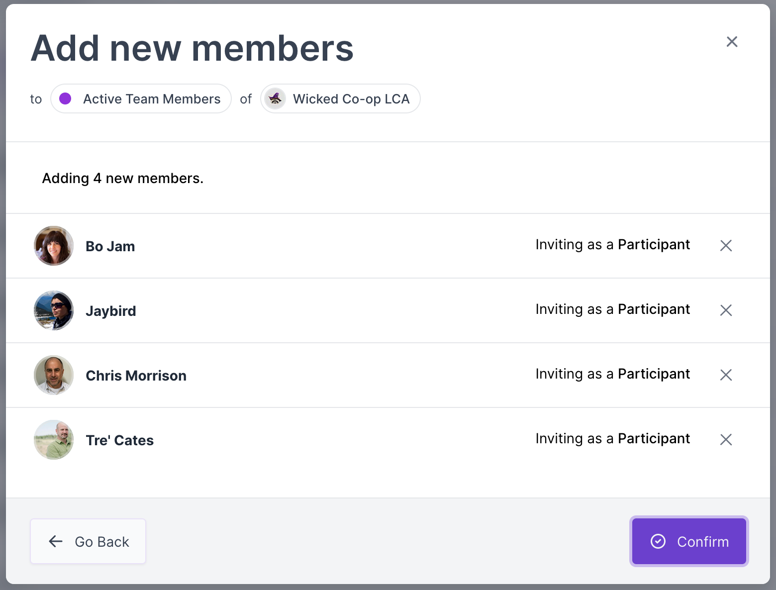 If you're a group leader, you can auto-add anyone. Otherwise, simply select the appropriate role and click Invite. You'll then be shown a confirmation screen where you can review who you're inviting and correct any errors.