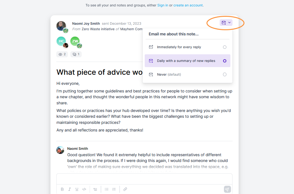Looking for your global email settings (Daily / Weekly / Never) across all your groups? Head to your Settings page in your Workspace.